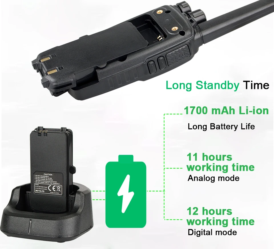 Supports both analog and digital two modes and can be selected freely, compatible with other analog or digital two-way radios, saving purchasing cost for you.