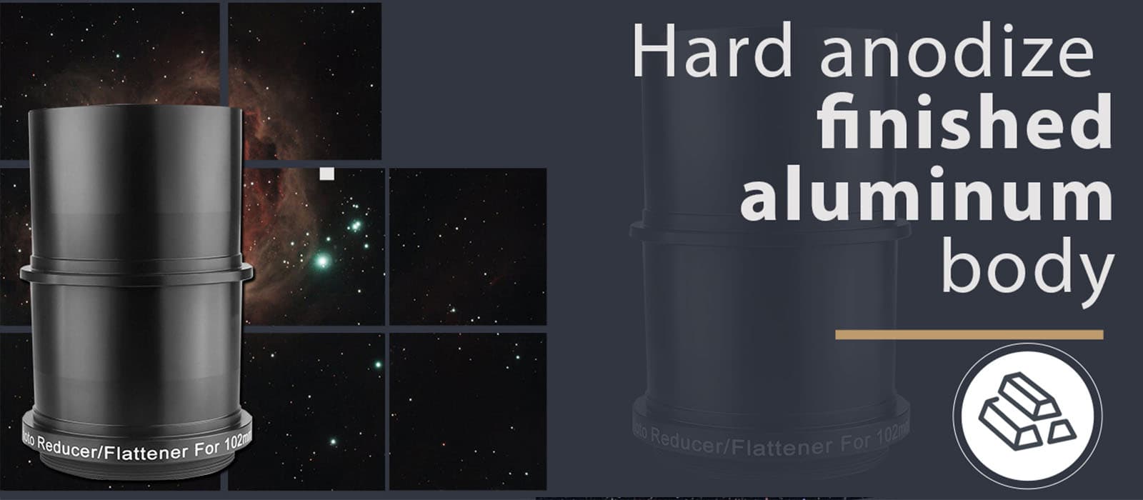The 0.8× reduction effectively converts the SV503 102ED from f/7 to approximately f/5.6, allowing shorter exposure times and improved signal collection for astrophotography.