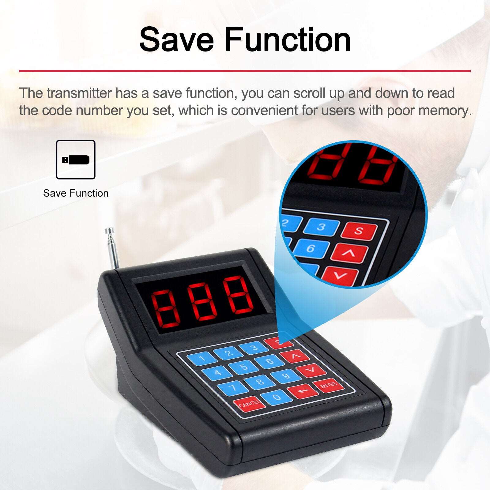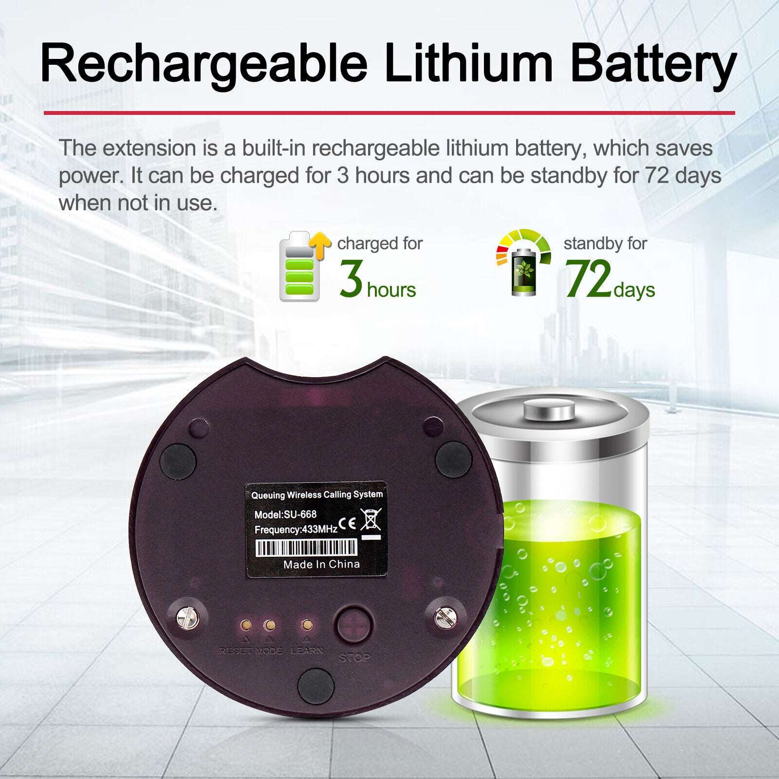Built in 3.7V rechargeable battery in each pager. With full charge it can be used for at least 72 hours standby, 36 hours in use. Independent storage memory avoiding data lost.