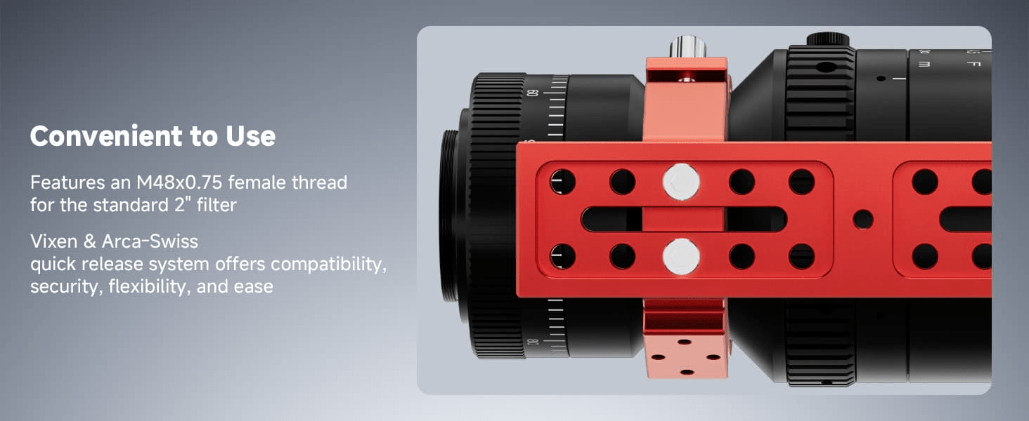 Svbony SV555 APO Telescope features an M48x0.75 filter thread to install the 2" filter; additionally; the V-style & Arca-Swiss quick-release system is compatible; flexible and easy to use; enhancing the efficiency.