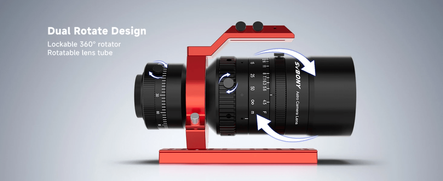 SV555 APO astro camera lens is featured with a handle; bracker; and dovetail plate; making it more convenient to use the lens when shooting. With a lockable 360° rotator and rotatable lens tube, the APO telephoto lens is convenient for adjusting and saving the angle. Whether daily shooting or astrophotography, you can find a suitable angle for a better shooting effect.