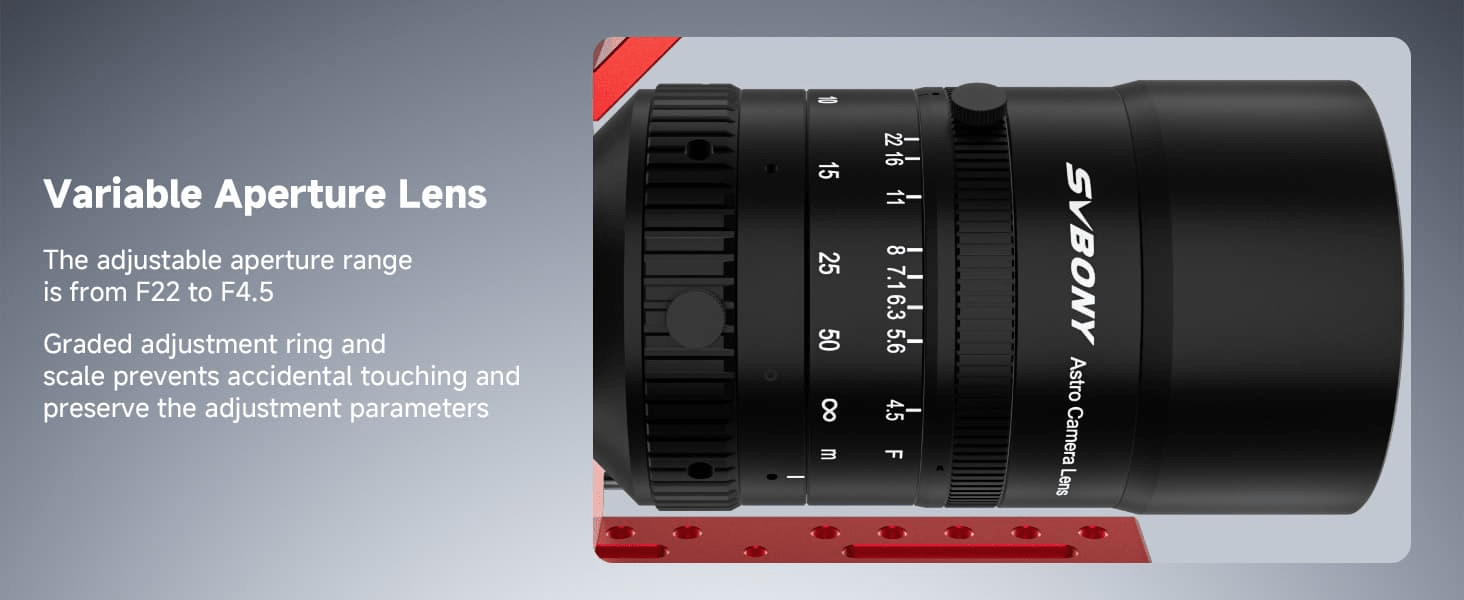 SV555 astrophotography telescope camera lens can adjust the aperture from F22 to F4.5; professional astronomical photography lens includes a graded adjustment ring and scale; keeping the parameters the same without changing due to accidental touching; increasing the accuracy of shooting, meeting a variety of use needs.