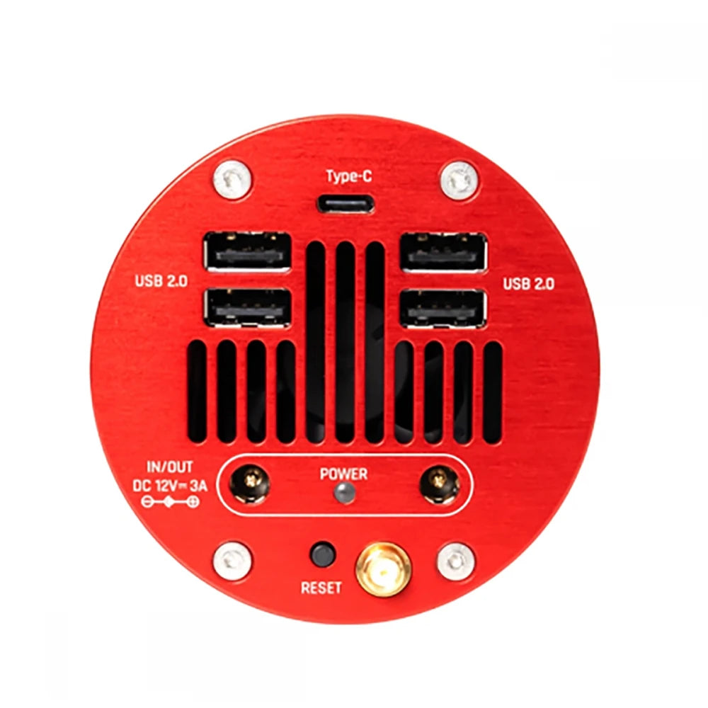 Four USB 2.0 ports for focuser, filter wheel and mount; dual 12V outputs; high-speed USB-C for data.