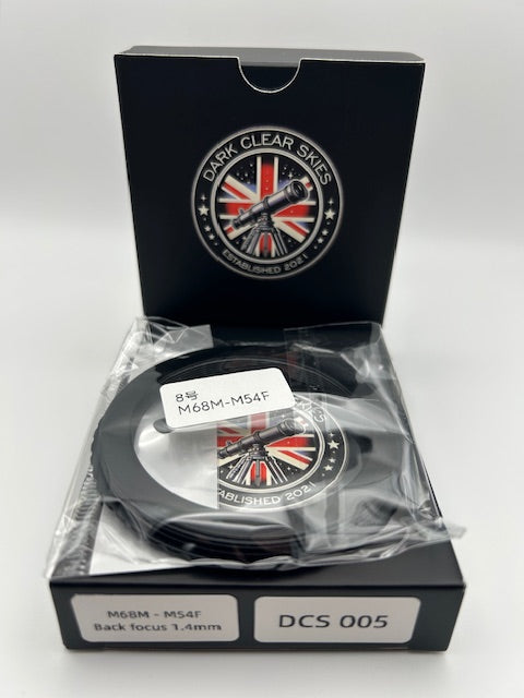 The Dark Clear Skies M68M to M54F Fine Back Focus Spacer (1.4 mm) is a precision-machined spacer designed for fine adjustment of back-focus distance in astrophotography imaging trains.