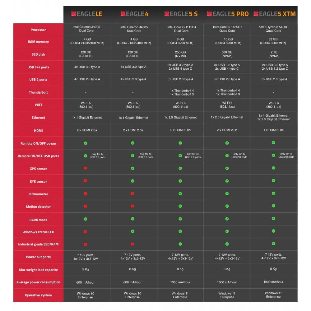 All of the EAGLE computers run Windows so you can install your preferred Windows software and use the devices you want, but in order to better suit everyone’s needs, we developed a complete line of EAGLE computers providing different computing power, memory capacity, disk space, advanced features and integrated sensors. This allows you to choose the EAGLE that best fits your application, power requirements and budget. In the table below you will find the specifications of all the EAGLE models with different processors, RAM memories, SSD disks, USB ports, HDMI ports, wireless and wired connectivity, integrated sensors and operative systems.