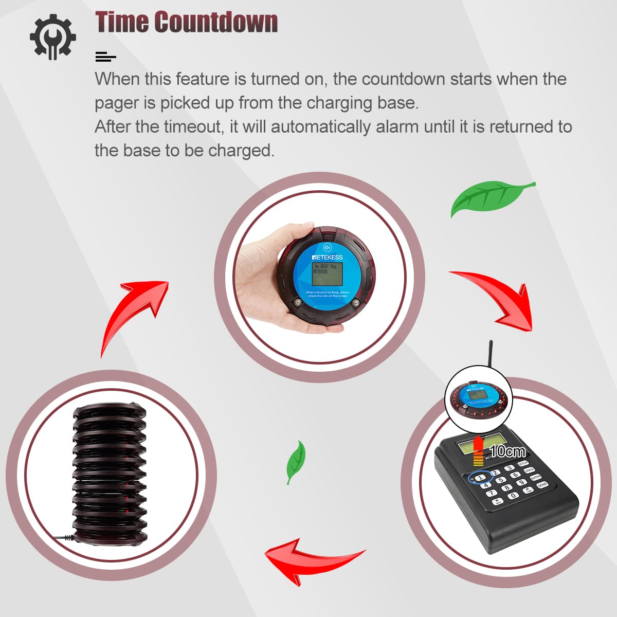- Once the pager is removed from the charging base, the pager will enable a countdown, when the set time is reached, the pager will beep/vibrate/flash automatically until put back into the charging base.